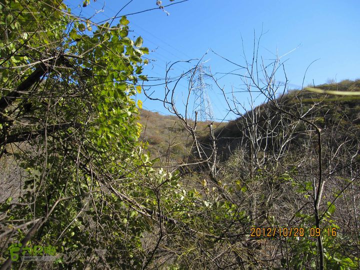沿谷底一路缓缓攀升,小路渐渐不太那么清晰了,但总能不时见到以前有人丢弃的垃圾,权作路标。抬头看时,右侧山上出现一座高压电线铁塔,事后才知这是28号铁塔,朝着这座铁塔走才是通往下庄的正确道路。