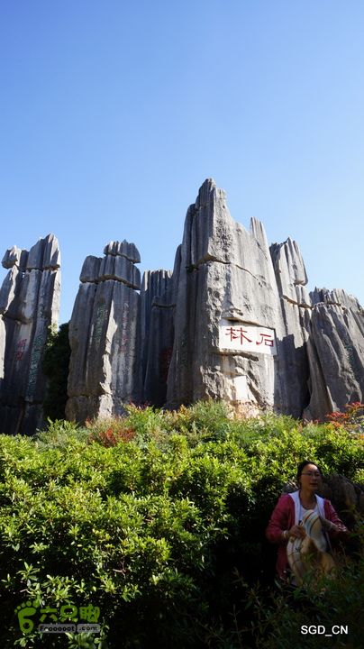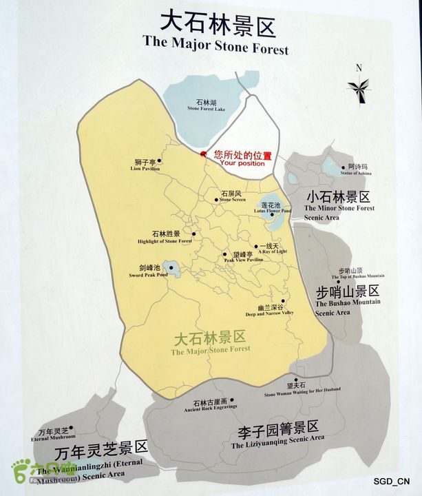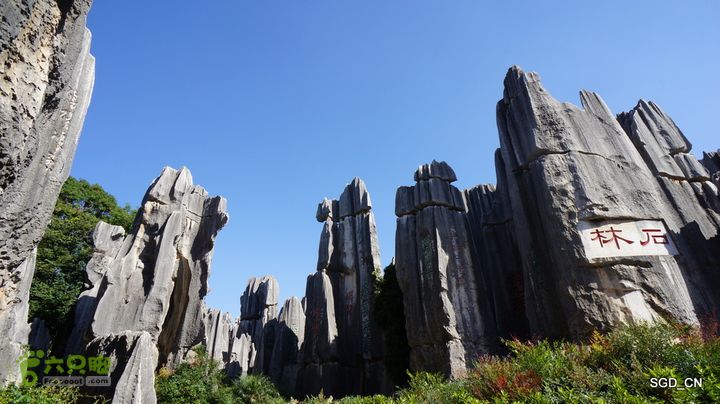 石林景区以被称为“剑状喀斯特地形”的岩溶地貌(喀斯特地貌)为主要特色。景区包括西北的步哨山、中心的大石林和小石林、南面的万年灵芝和东面的李子园箐五个片区,面积约12平方公里。其中的万年灵芝、李子园菁和步哨山是新开发的景点。深、幽、险、奇是石林景区的景观特征。进入景区内,但见石柱、石壁、石峰千姿百态,争奇竞丽。